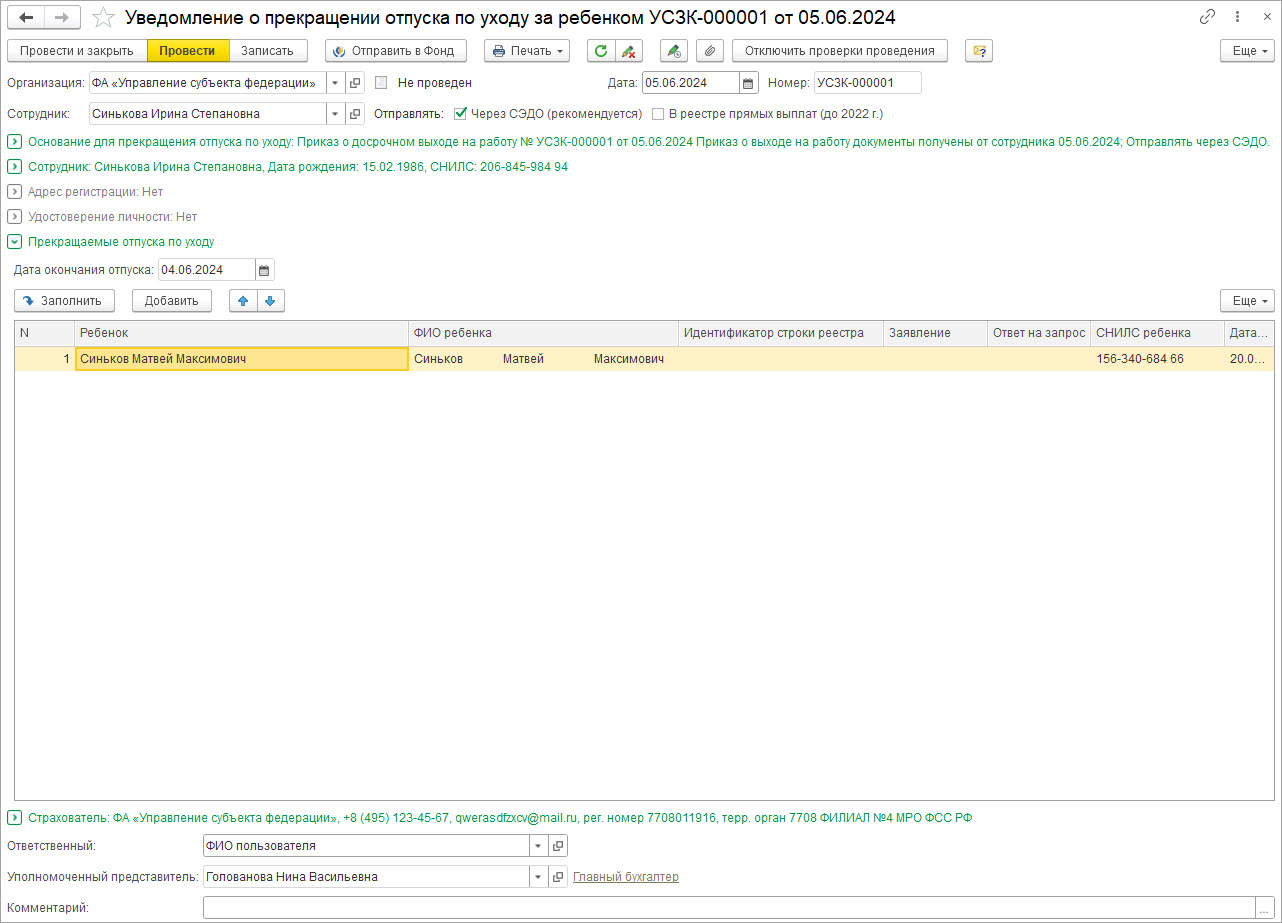 В программе после регистрации возврата сотрудника из отпуска по уходу за ребенком документом Возврат из отпуска по уходу (рис. 11) или при увольнении сотрудника документом Увольнение необходимо создать документ Уведомление о прекращении отпуска по уходу за ребенком (раздел Отчетность, справки – Передача в ФСС сведений о пособиях – кнопка Создать или из документов Увольнение, Возврат из отпуска по уходу на закладке Прямые выплаты ФСС).