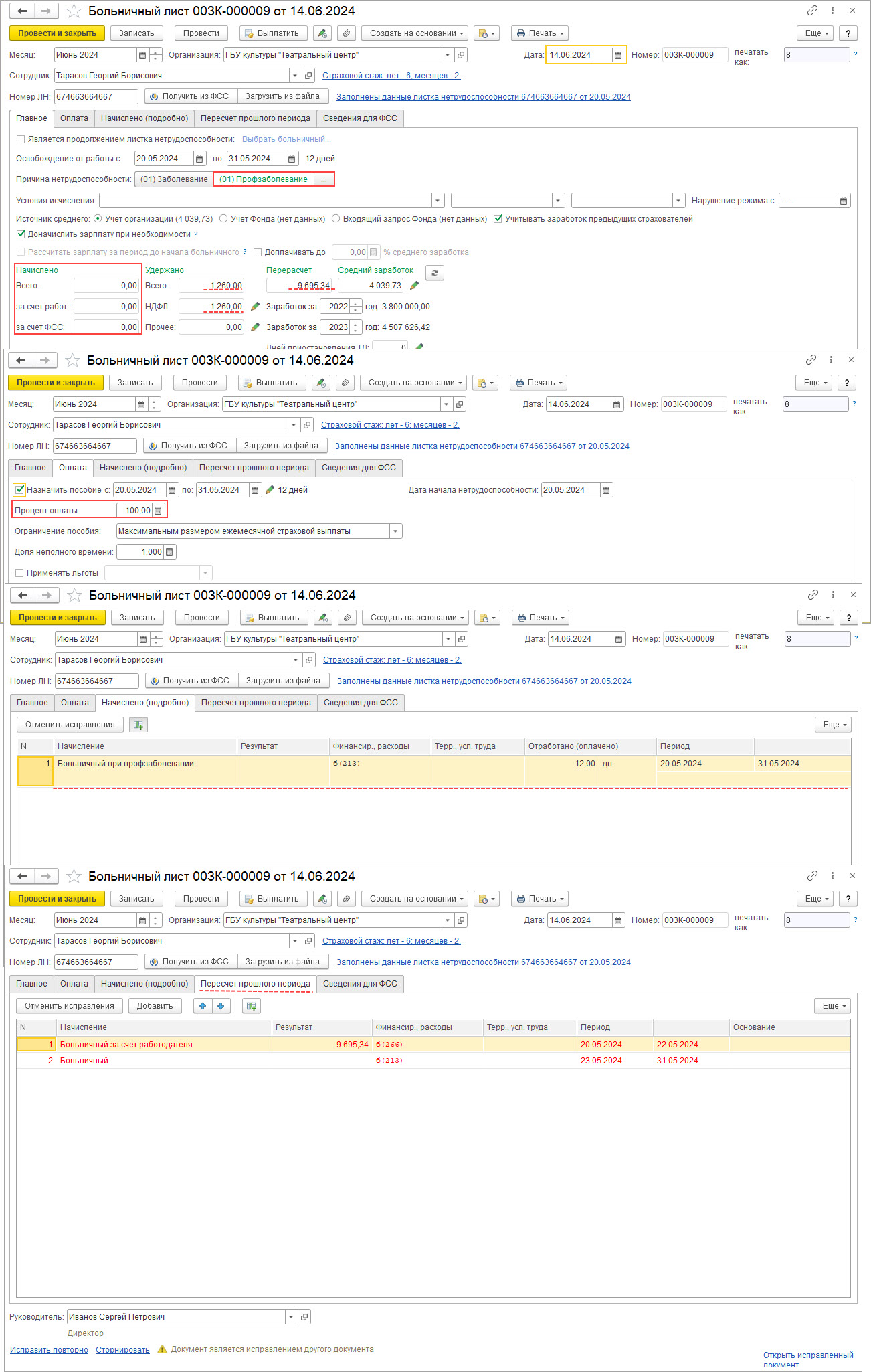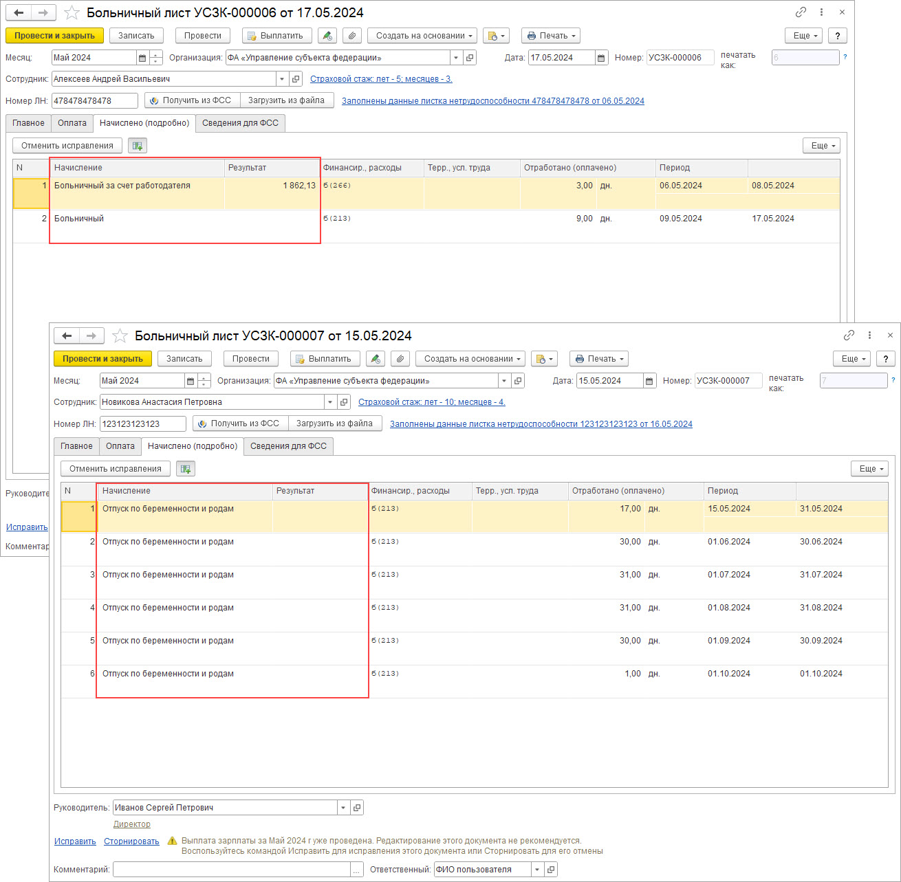 Если документом Больничный лист регистрируется отпуск по беременности и родам, то в документе пособие не рассчитывается, формируются строки с нулевым результатом расчета, т. к. пособие по беременности и родам выплачивается полностью за счет средств СФР. Подробнее о заполнении полей документа Больничный лист и расчете пособий по временной нетрудоспособности и по беременности и родам при различных условиях назначения смотрите в разделах Расчет пособия по временной нетрудоспособности, Расчет пособия по беременности и родам.