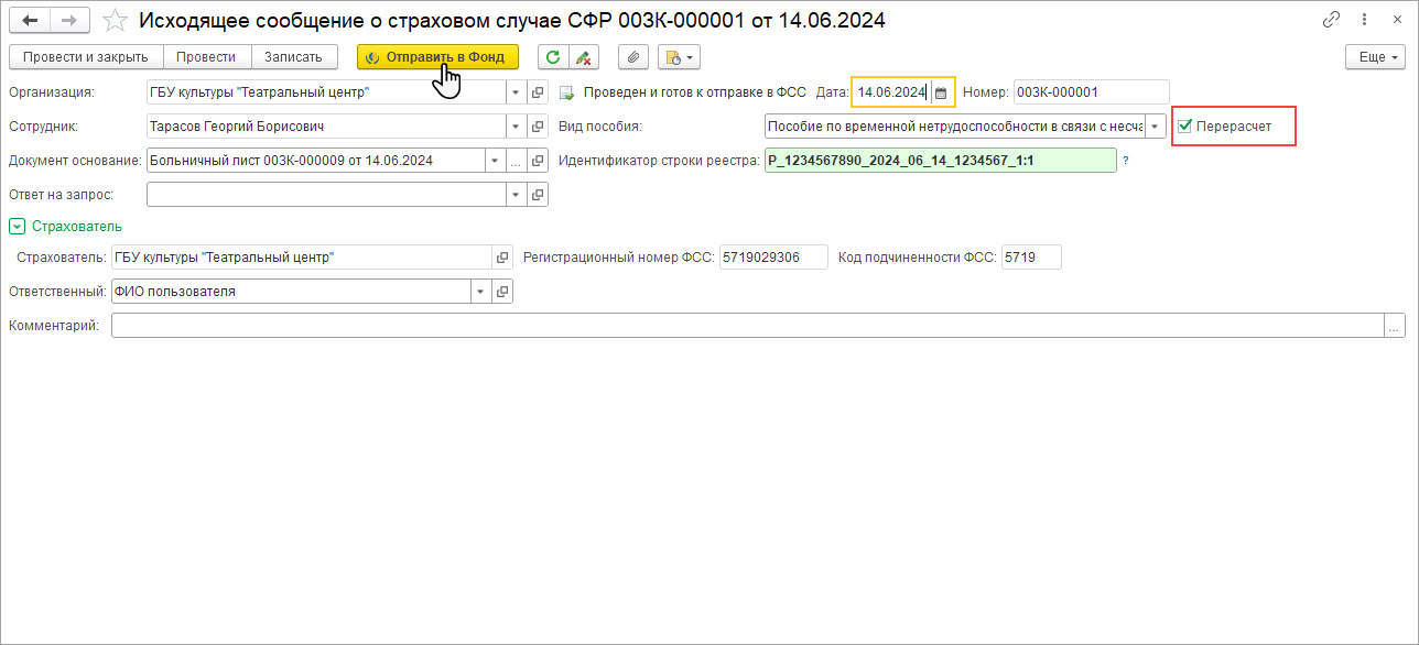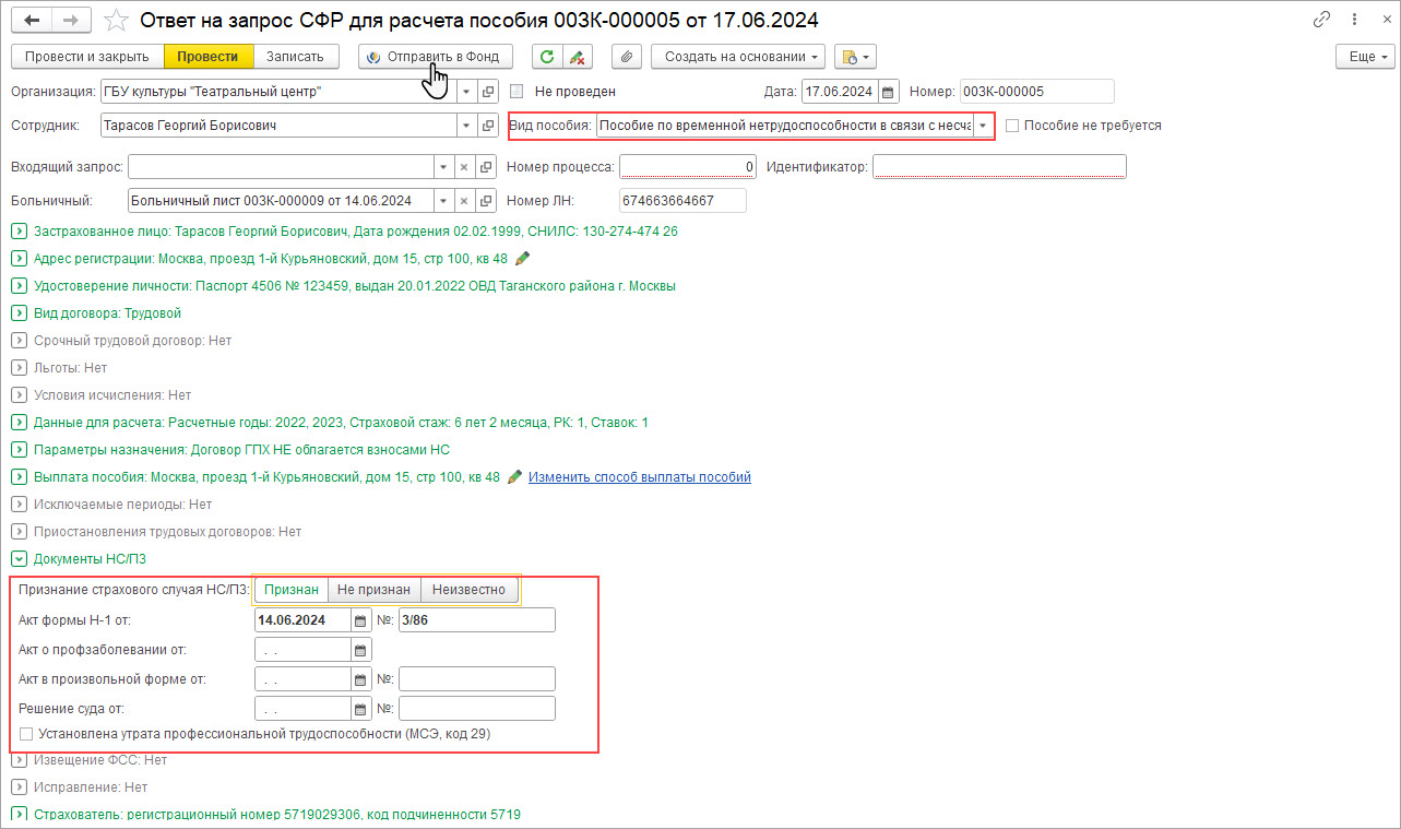 - Далее необходимо сформировать документ Исходящее сообщение о страховом случае СФР (см. статью Исходящее сообщение о страховом случае