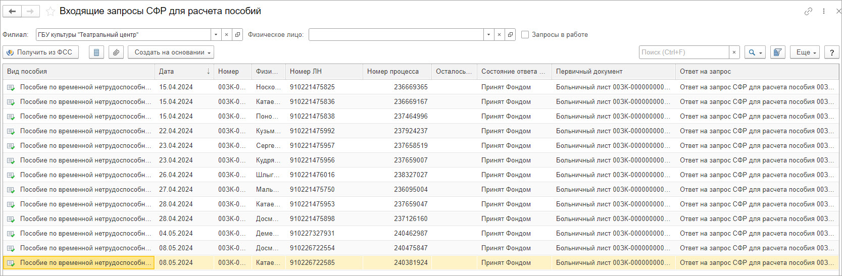 - Запрос из фонда о сведениях, которые работодатель должен отправить фонду для выплаты пособия, поступит в рабочее место Входящие запросы СФР для расчета пособий (раздел Кадры) (рис. 3).