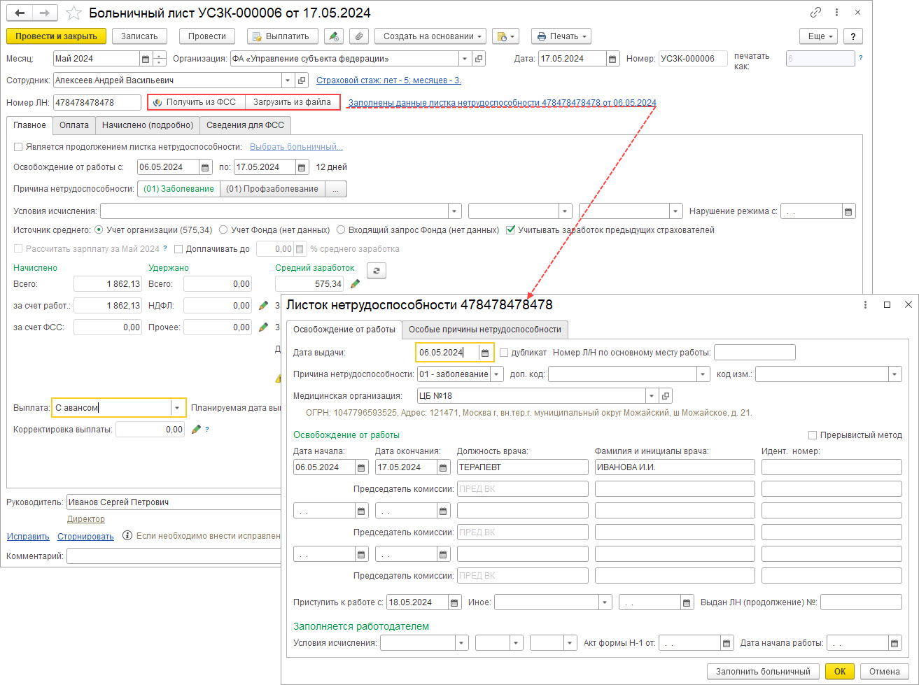 По кнопке Получить из ФСС документ автоматически заполняется данными ЭЛН (если документ создается автоматически, то он заполняется при первом открытии). Чтобы загрузить сведения ЭЛН из файла, выгруженного из личного кабинета страхователя на сайте СФР, нажмите на кнопку Загрузить из файла и выберите необходимый файл. По ссылке Заполнены данные листка нетрудоспособности в шапке документа можно увидеть, что данные листа заполнены автоматически (рис. 5).