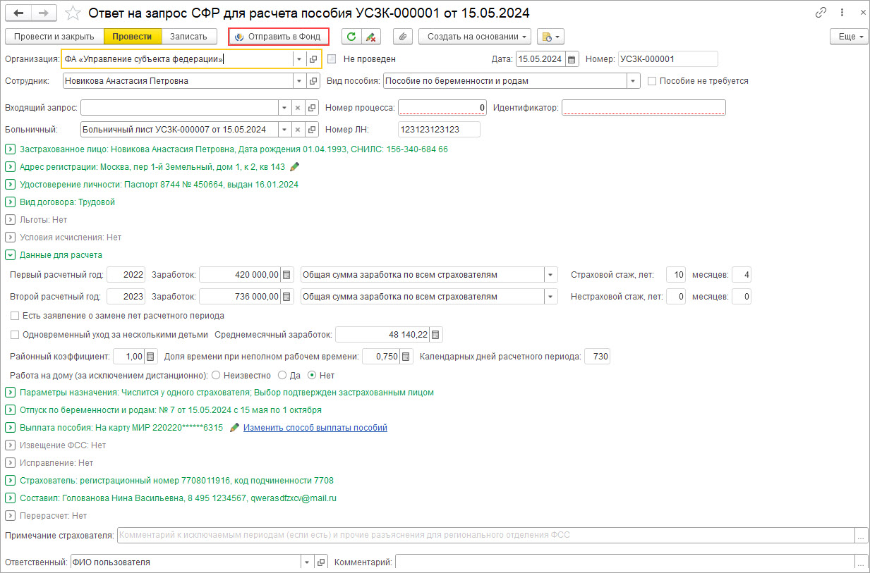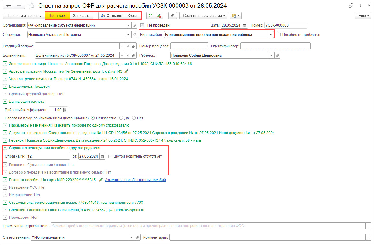 - Далее для формирования ответа на запрос фонда необходимо зарегистрировать документ Ответ на запрос СФР для расчета пособия. Документ можно создать из рабочего места Ответы на запросы СФР для расчета пособий (раздел Кадры) или на основании входящего запроса от СФР по кнопке Создать на основании (рис. 7). Проверьте заполненные сведения, обратите внимание на районный коэффициент, т. к. он влияет на размер пособия, а также внесите реквизиты справки второго родителя о том, что он пособие не получал. Можно непосредственно из программы отправить ответ в фонд по кнопке Отправить в Фонд.