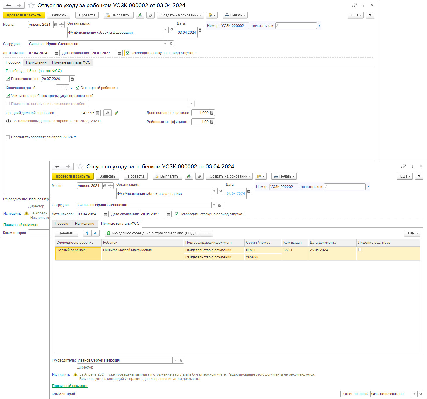 в СФР). Документ можно создать из раздела Кадры – Исходящие сообщения о страховых случаях СФР или из документа Отпуск по уходу за ребенком по кнопке Исходящее сообщение о страховом случае (СЭДО) на закладке Прямые выплаты ФСС (рис. 9). В поле Вид пособия будет указано