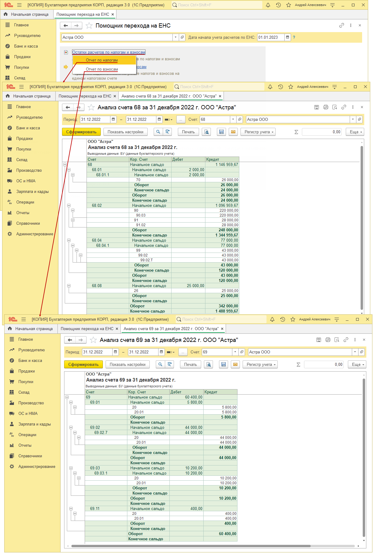 Начисления налогов (взносов) (кредитовые обороты по счетам 68 и 69), которые отражены в декабре, по этой аналитике помощник не обрабатывает. Предполагается, что они либо будут уплачены в декабре (если срок уплаты в декабре 2022 года), либо по ним будут в штатном режиме формироваться документы "Уведомление об исчисленных суммах налогов" или "Операция по ЕНС" соответствующими Помощниками из "Списка задач организации" по факту наступления сроков (если срок уплаты в январе 2023 или позже). Но если имеет место какая-то нештатная ситуация (например, налог начислен в декабре, должен быть уплачен в декабре, но по каким-то причинам его не уплатили), то перенести на единый налоговый счет задолженность перед бюджетом в этой ситуации нужно вручную. - Выбираются остатки по кредиту субсчетов к счетам 68 и 69 с аналитикой "Налог (взносы) доначислено / уплачено (самостоятельно)" и "Налог (взносы) доначислено / уплачено (по акту проверки)" на 31.12.2022.