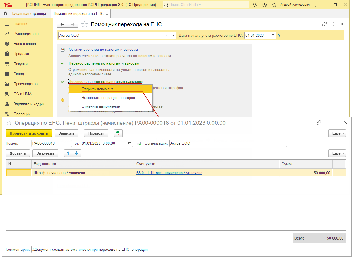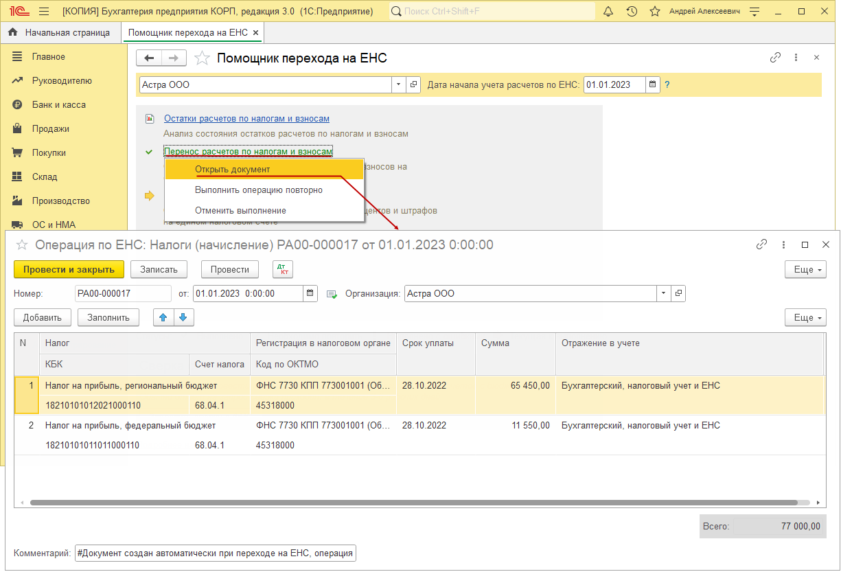 Для автоматического ввода входящего начального остатка на едином налоговом счете по данным учета в программе предназначен "Помощник перехода на ЕНС".