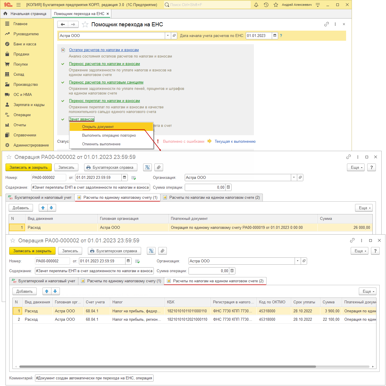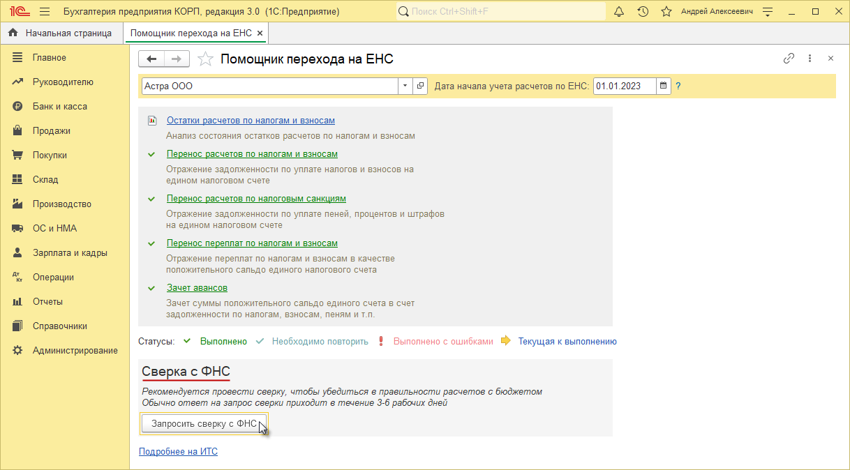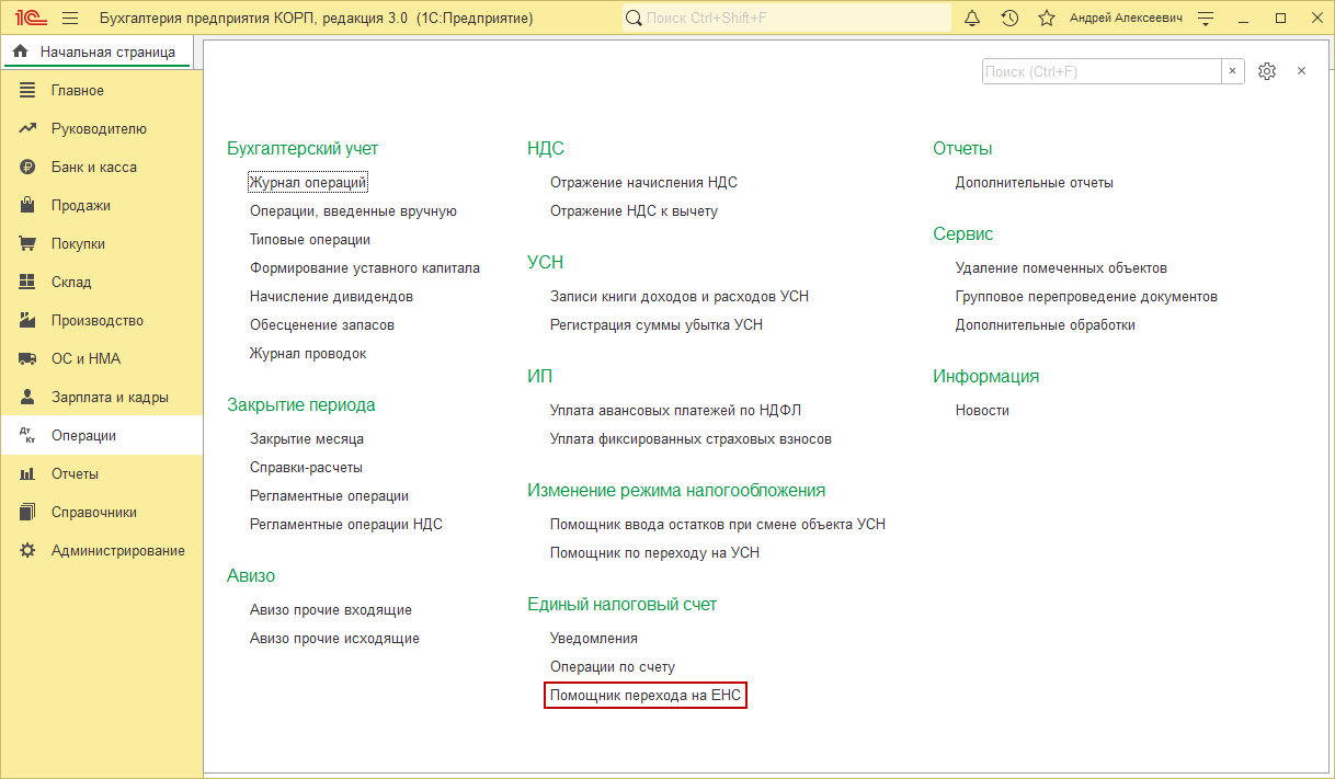 - Раздел: Операции – Помощник перехода на ЕНС (рис. 1):