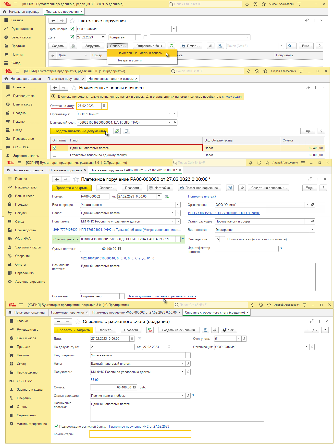 - По кнопке "Создать платежные документы" создайте документ "Платежное поручение". Поля документа заполнятся автоматически, сумма переносится из формы "Начисленные налоги и взносы". Проведите документ по кнопке "Провести".