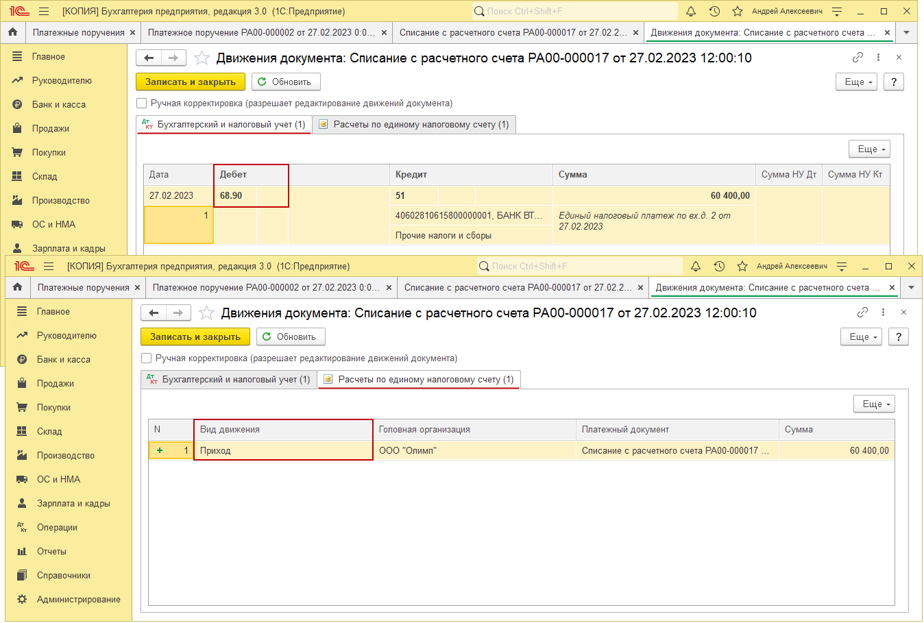 посмотрите результат проведения документа "Списание с расчетного счета" (рис.