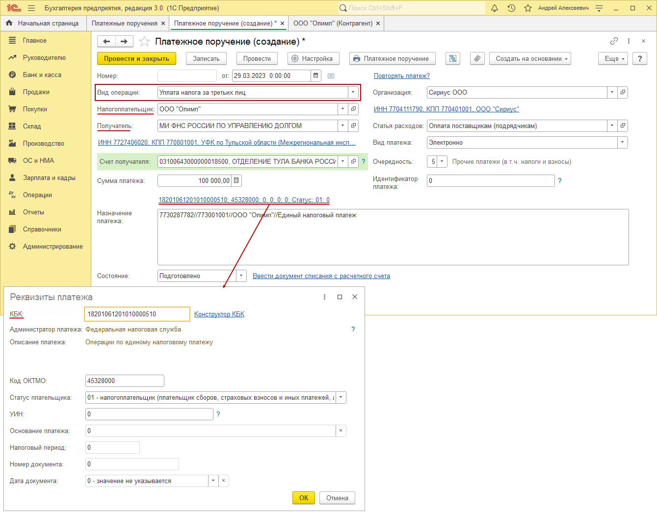 - Выберите вид операции – "Уплата налога за третьих лиц".
