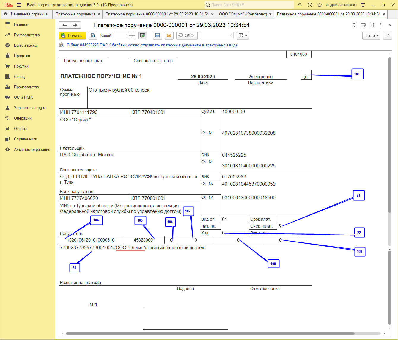 - в поле "Номер документа" (поле 108 платежного поручения) укажите "0";