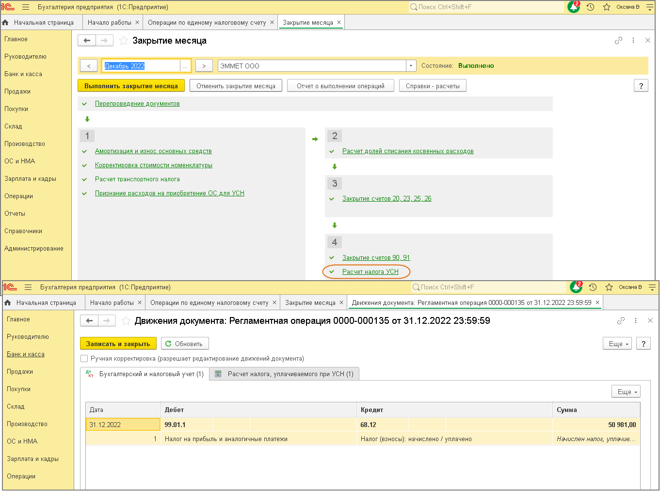 Расчет и начисление налога по УСН (авансовых платежей по налогу) в программе выполняется одноименной регламентной операцией в составе обработки "Закрытие месяца" в последнем месяце каждого квартала и в декабре отчетного года (рис. 1).