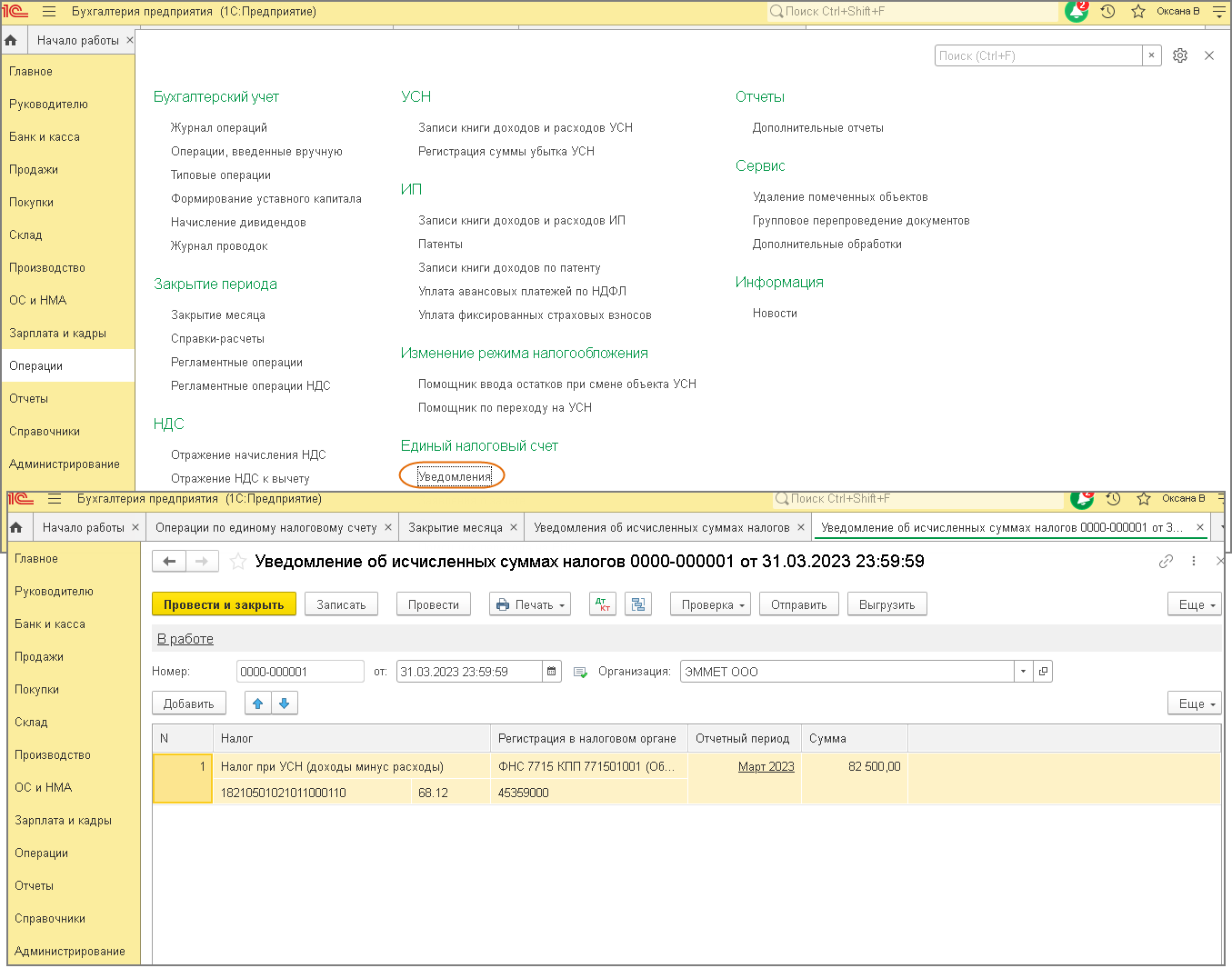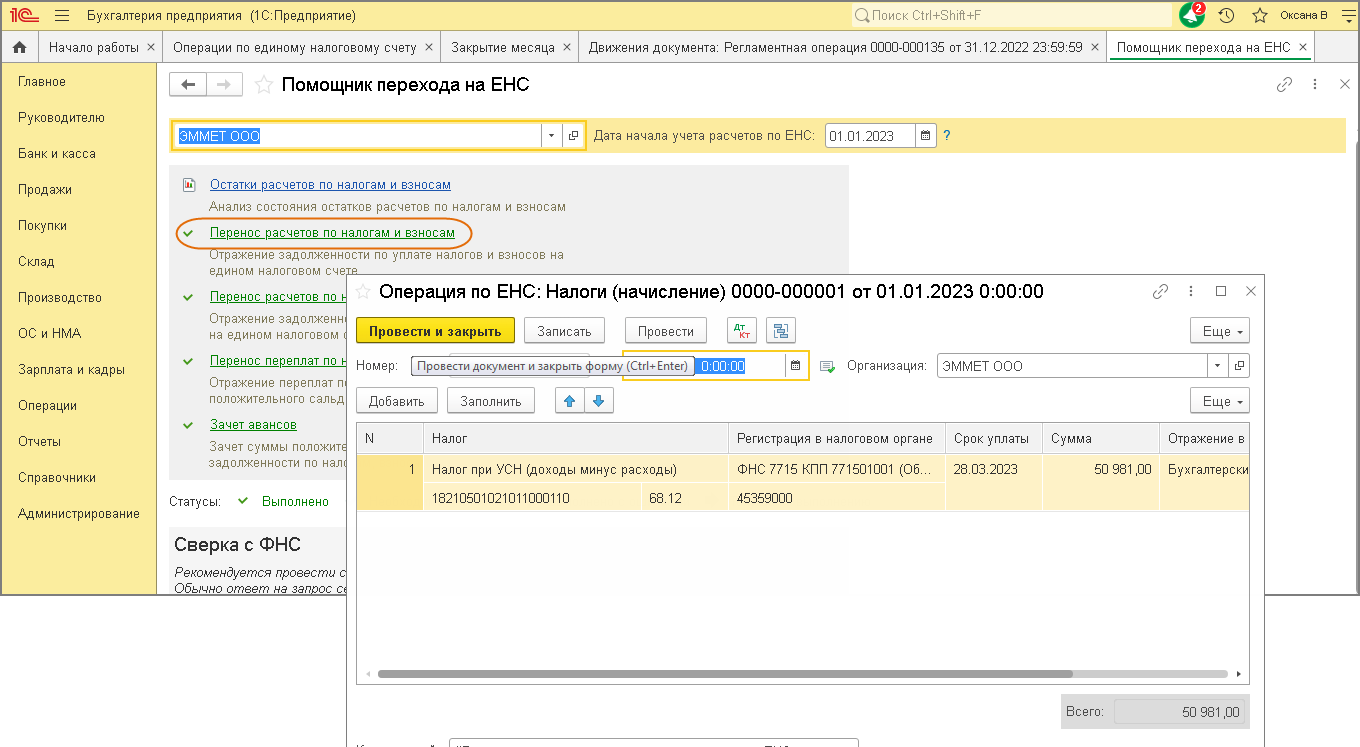 Для переноса задолженности по начисленному налогу на счет 68.90 "Единый налоговый счет" и формирования совокупной налоговой обязанности (п. 5 ст. 11.3 НК РФ) используется документ "Операция по ЕНС" (уведомление по налогу не подается, поскольку платеж перечисляется после представления декларации по УСН). Для переноса задолженности по налогу, начисленному за 2022 год, используйте "Помощник перехода на ЕНС" (раздел Операции – Помощник перехода на ЕНС) (рис. 2), подробнее об этом см. здесь.