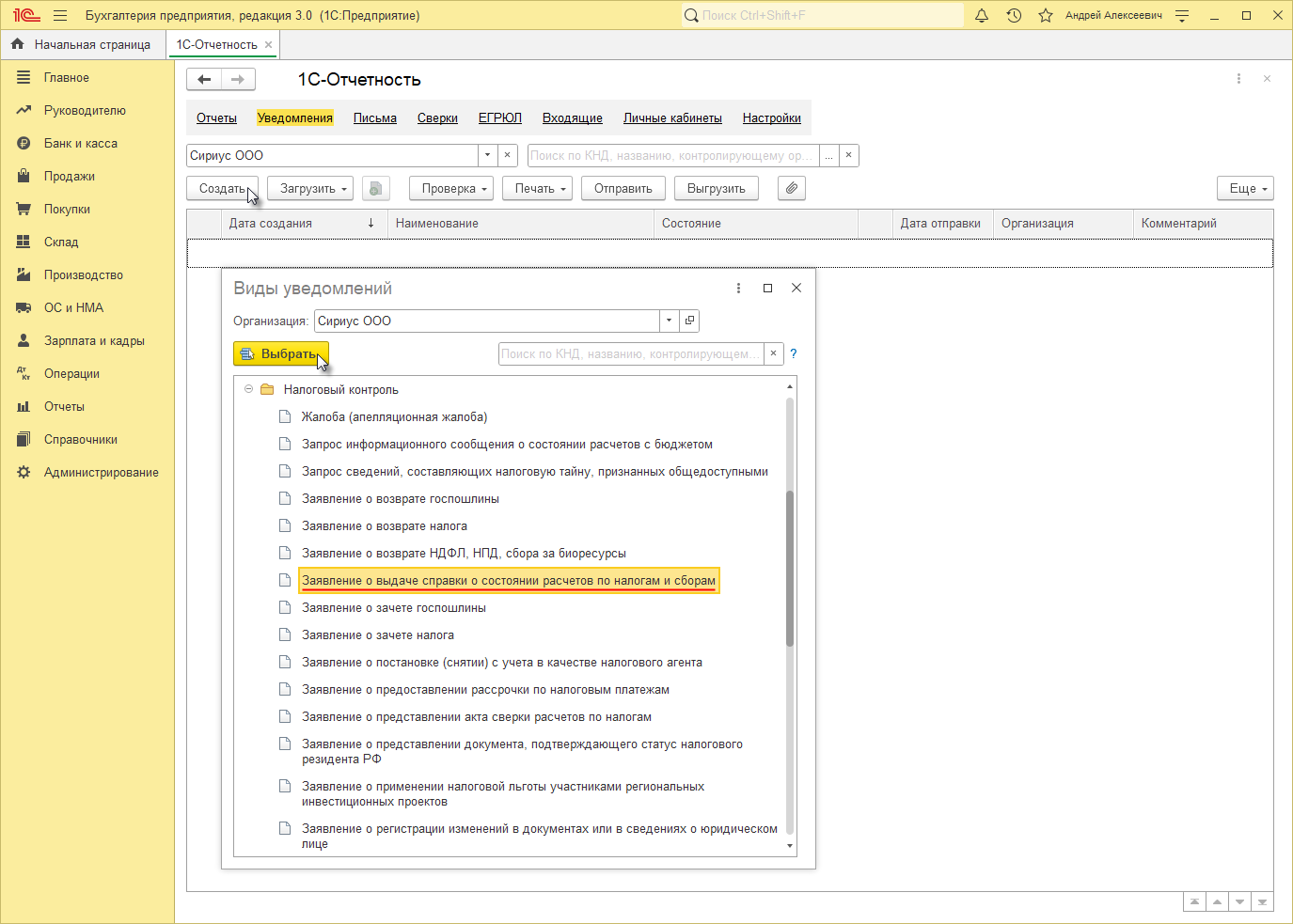 - В открывшейся форме выберите организацию-налогоплательщика (если учет в базе ведется по нескольким организациям), раскройте группу "Налоговый контроль", выделите мышью отчет "Заявление о выдаче справки о состоянии расчетов по налогам и сборам" и откройте его двойным щелчком мыши или по кнопке "Выбрать".