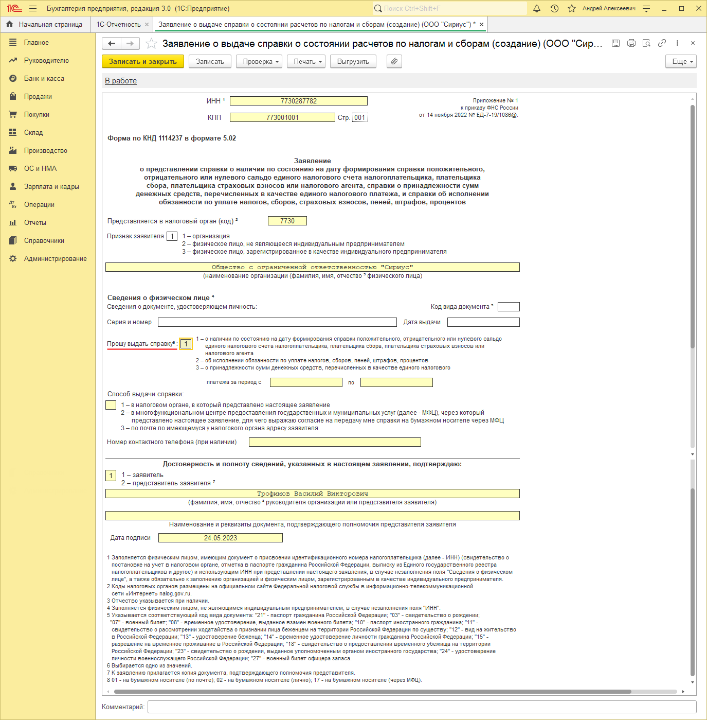 Функционал программы позволяет сформировать заявление в ИФНС о предоставлении справки по форме КНД 1114237 о наличии сальдо (положительного, отрицательного, нулевого) на едином налоговом счете (ЕНС), о принадлежности сумм денежных средств, перечисленных в качестве единого налогового платежа (ЕНП), и об исполнении обязанности по уплате налогов, сборов, страховых взносов, пеней, штрафов, процентов (приказ ФНС России от 14.11.2022 № ЕД-7-19/1086@).