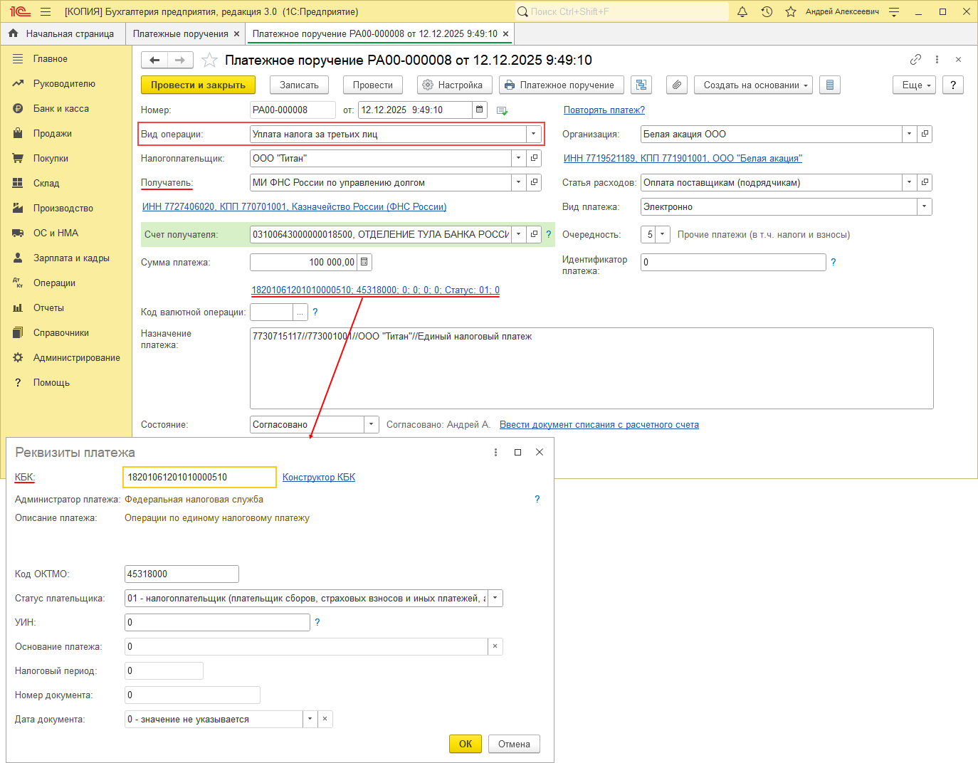 - выберите вид операции – "Уплата налога за третьих лиц";