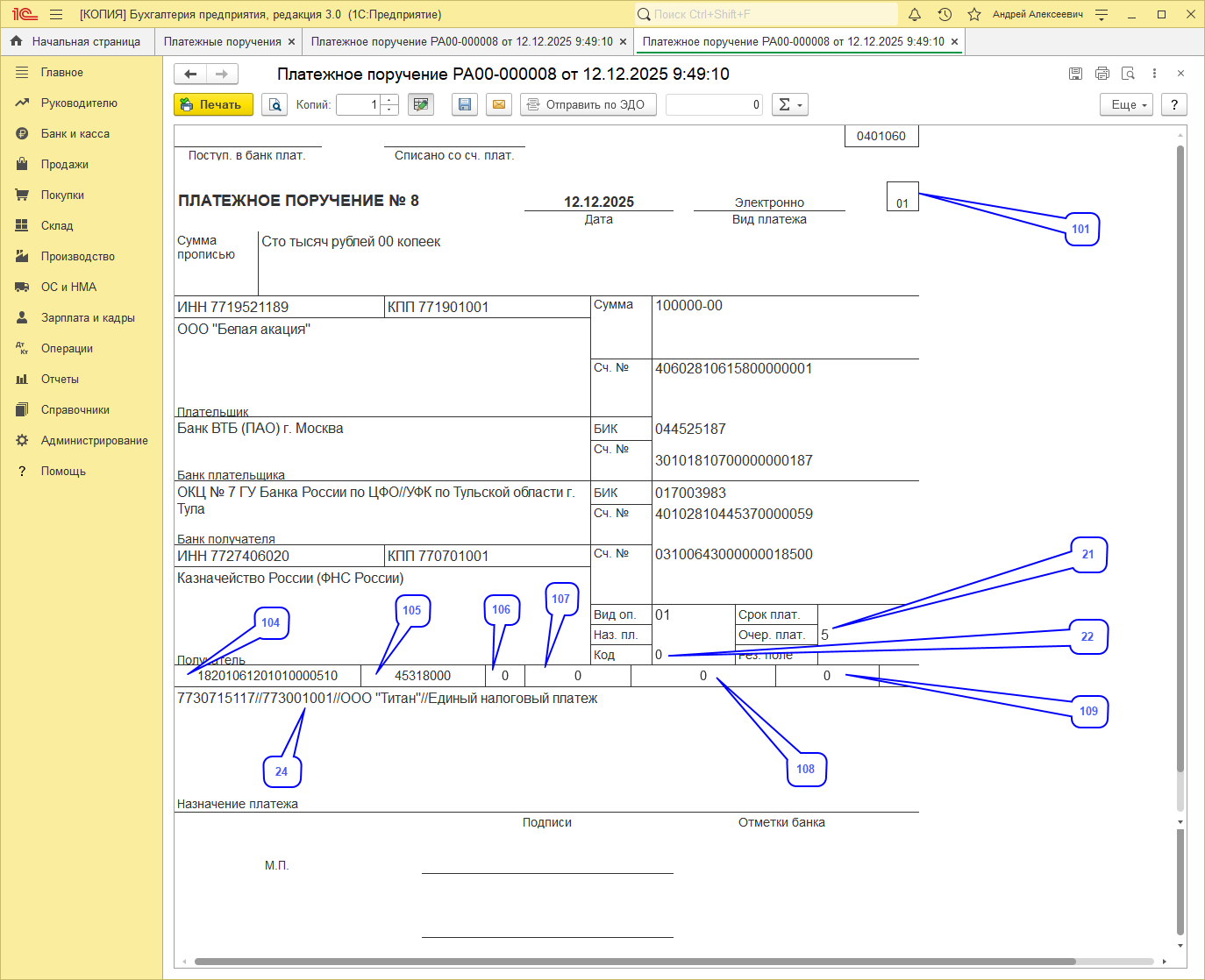 - в поле "Дата документа" (поле 109 платежного поручения) автоматически проставляется "0";
