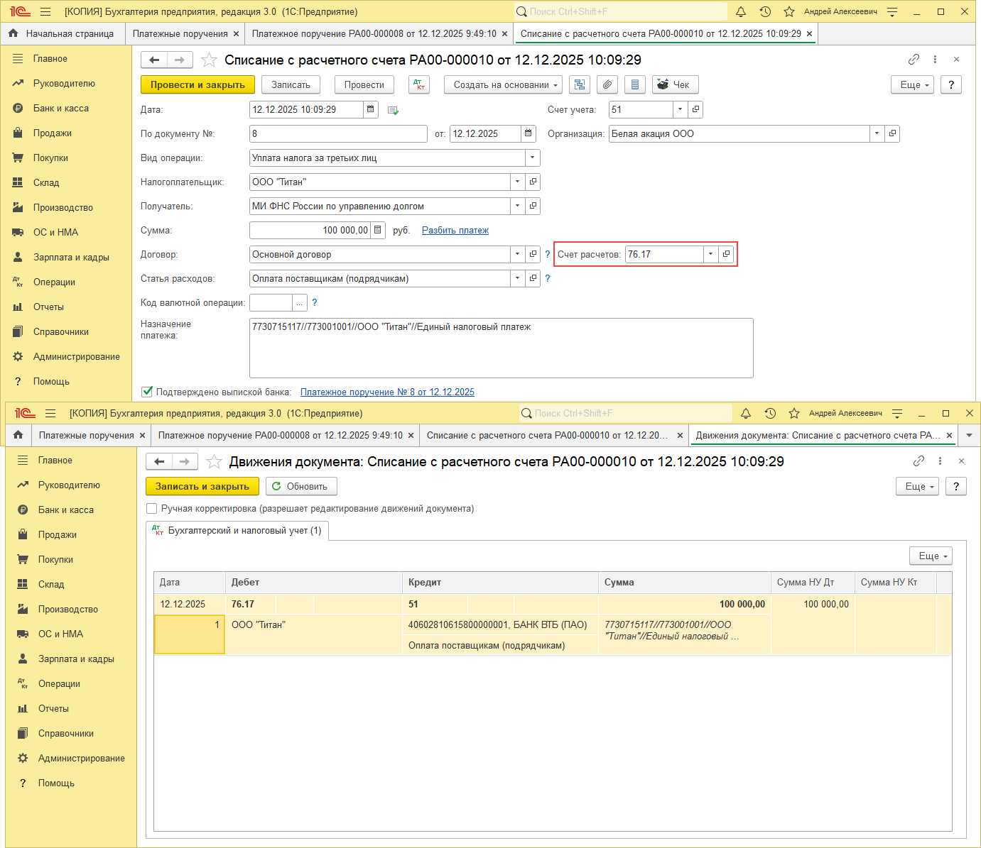 - Создайте документ "Списание с расчетного счета", для этого в платежном поручении пройдите по ссылке "Ввести документ списания с расчетного счета". В открывшейся форме документа "Списание с расчетного счета" в поле "Счет расчетов" выберите счет 76.17 "Расчеты по налогам с третьими лицами", проверьте заполнение остальных полей документа. Флажок "Подтверждено выпиской банка" устанавливается автоматически. Кнопка "Провести".