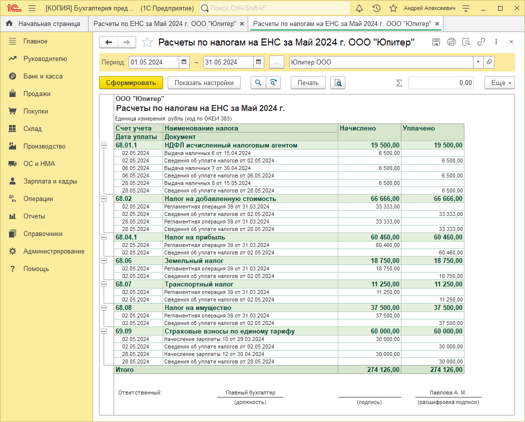 Отчет "Расчеты по налогам на ЕНС" (раздел Отчеты – Расчеты по налогам на ЕНС).