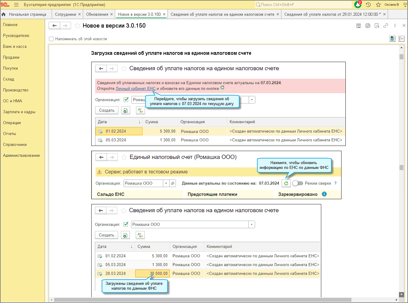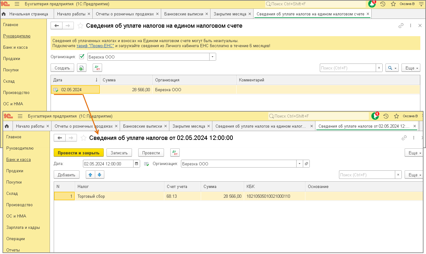 Подробнее о том, как подготовить платежные поручения на уплату единого налогового платежа (ЕНП) и отразить списание денежных средств при уплате ЕНП, см. здесь.