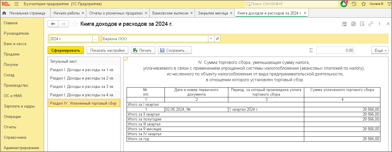 После проведения документа "Сведения об уплате налогов на едином налоговом счете" сумма будет автоматически отражена в КУДиР в разделе IV "Торговый сбор" (рис. 3).
