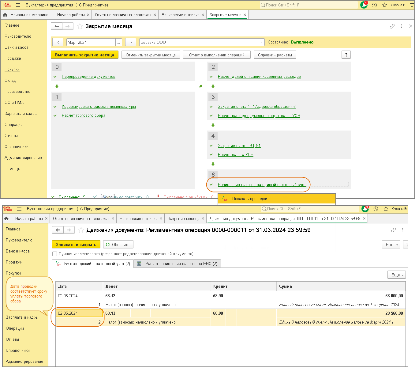 Таким образом, дата регламентной операции (в примере – 31.03.2024) и дата проводки по переносу задолженности по торговому сбору на ЕНС (в примере 02.05.2024 – предельная дата уплаты торгового сбора за 1-й квартал 2024 года), сформированной этой регламентной операцией, отличаются (рис. 4).