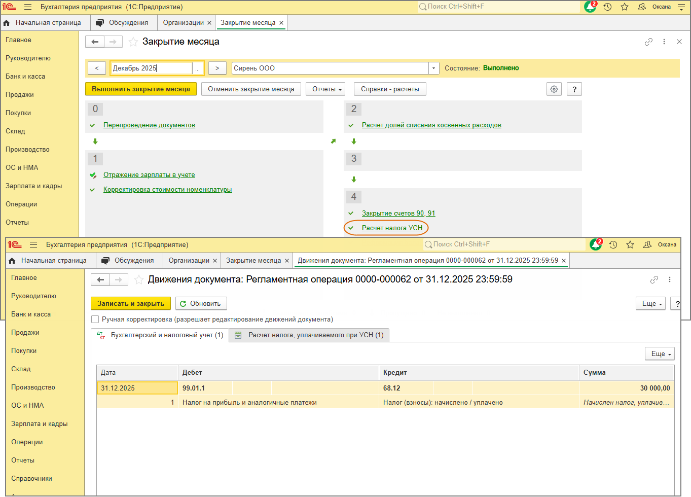 Расчет и начисление налога по УСН (авансовых платежей по налогу) в программе выполняется одноименной регламентной операцией Расчет налога по УСНв составе обработки Закрытие месяца в последнем месяце каждого квартала и в декабре отчетного года (рис. 1).