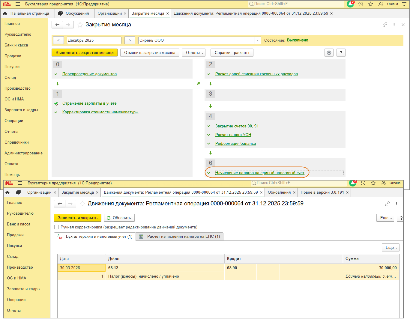 Проводки по переносу задолженности по уплате налогов (авансовых платежей по налогам) на ЕНС формируются на дату срока уплаты этих налогов или авансовых платежей по ним в соответствии с нормами НК РФ. Таким образом, дата регламентной операции (в примере - 31.12.2025) и дата проводки по переносу задолженности по налогу по УСН (авансовых платежей по налогу) на ЕНС (в примере 30.03.2026 - предельная дата уплаты налога по УСН за 2025 год), отличаются.