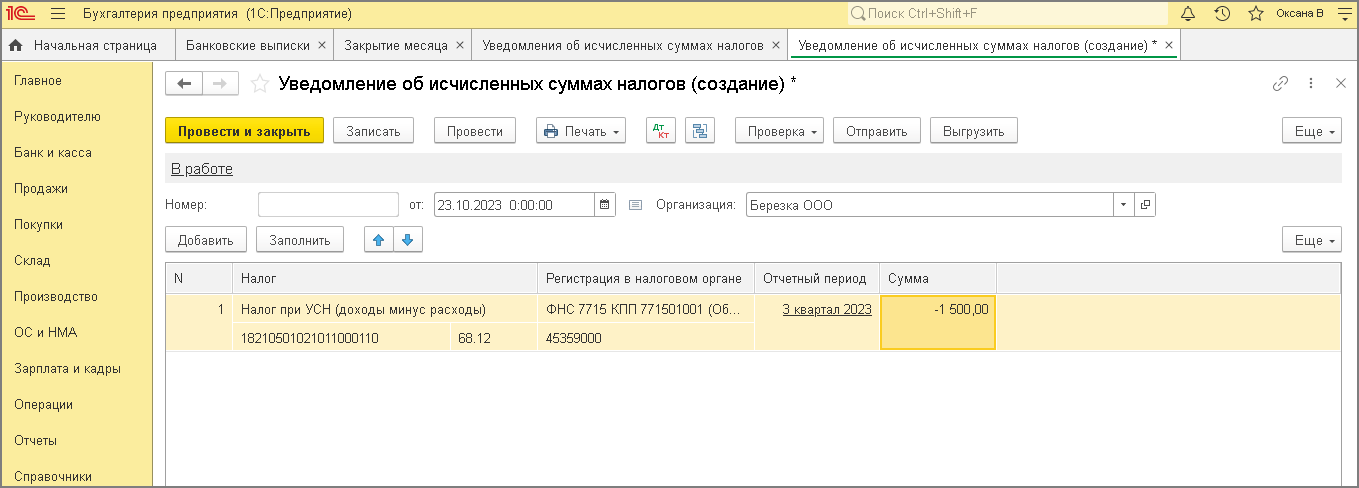 Как в "1С:Бухгалтерии 8" (ред. 3.0) при УСН сформировать уведомление с отрицательной суммой?