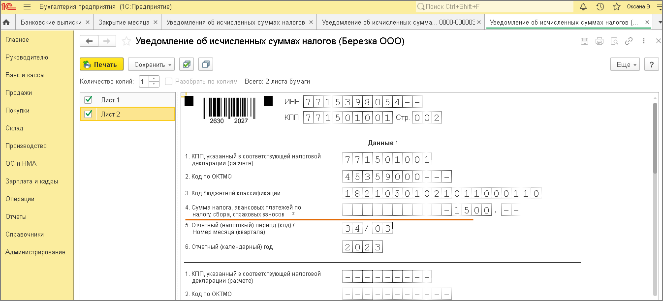 В ситуации, когда сумма аванса за отчетный период меньше, чем исчисленные авансы за предыдущие периоды (аванс к уменьшению) в уведомлении в строке 4 "Сумма налога, авансовых платежей по налогу, сбора, страховых взносов" следует указать отрицательную сумму авансового платежа. В программе "1С:Бухгалтерия 8", отрицательную сумму налога можно указать в документе "Уведомлении об исчисленных суммах налогов" (рис. 1). В печатной форме уведомления в этом случае по строке 4 отражается сумма налога (авансового платежа по налогу) с минусом (рис. 2).