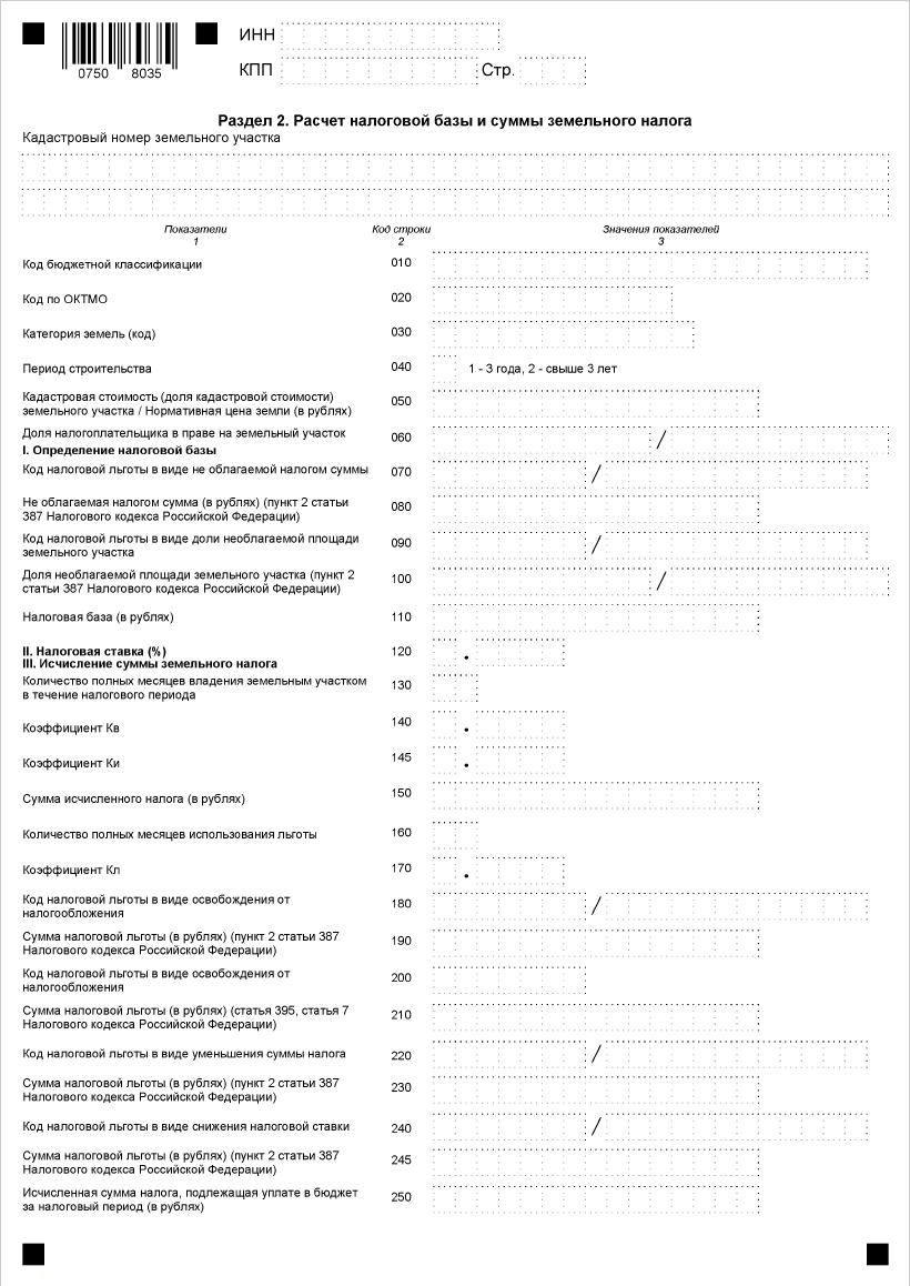 строка с кодом 245 = ((строка с кодом 110 x (налоговая ставка - пониженная ставка) x строка с кодом 140) : 100 x строка с кодом 145) x 4 (при наличии коэффициента Ки); - по строке с кодом 250 указывается исчисленная сумма земельного