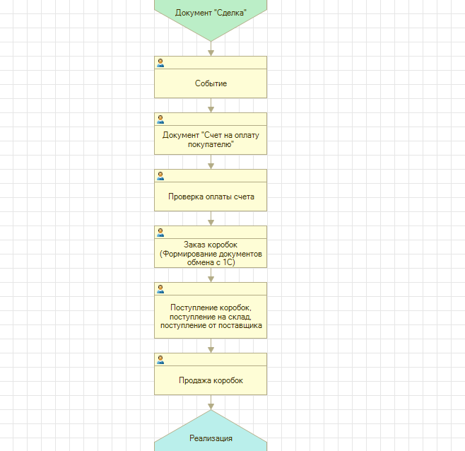 Данный алгоритм отражает основные этапы процесса продажи коробок «1С»: после звонка пользователя и согласования стоимости коробки клиенту выставляется счет, затем подтверждается его оплата, осуществляется заказ коробки, фиксируется факт поступления коробки, оформляется продажа и реализация.