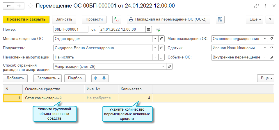 Полный интерфейс: меню "ОС и НМА - Учет основных средств - Перемещение ОС".