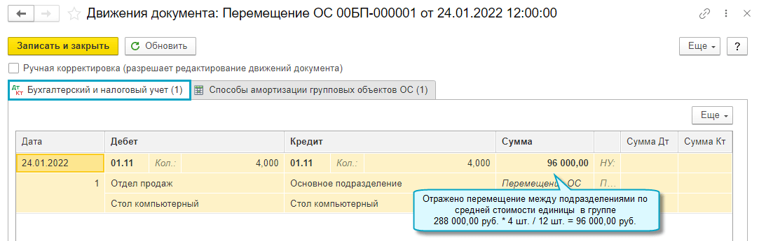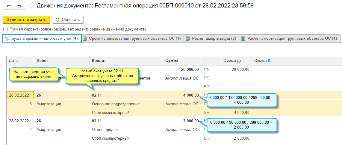 Амортизация группового объекта за месяц распределяется между подразделениями пропорционально балансовой стоимости (до начисления амортизации) находящихся в них основных средств.
