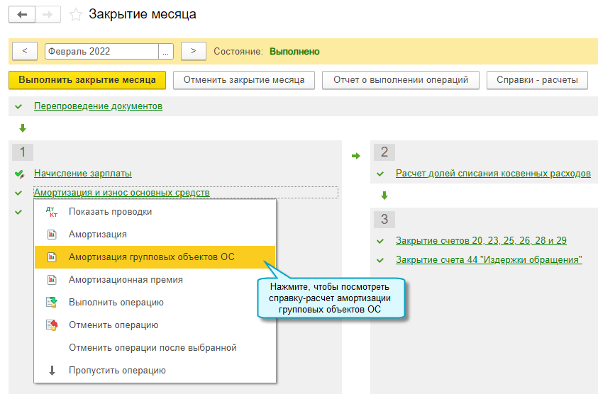 Полный интерфейс: меню "Операции - Закрытие периода - Закрытие месяца".