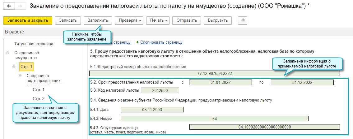 Заявление заполняется как при применении общей льготы ко всей недвижимости организации, так и при льготировании отдельных объектов.