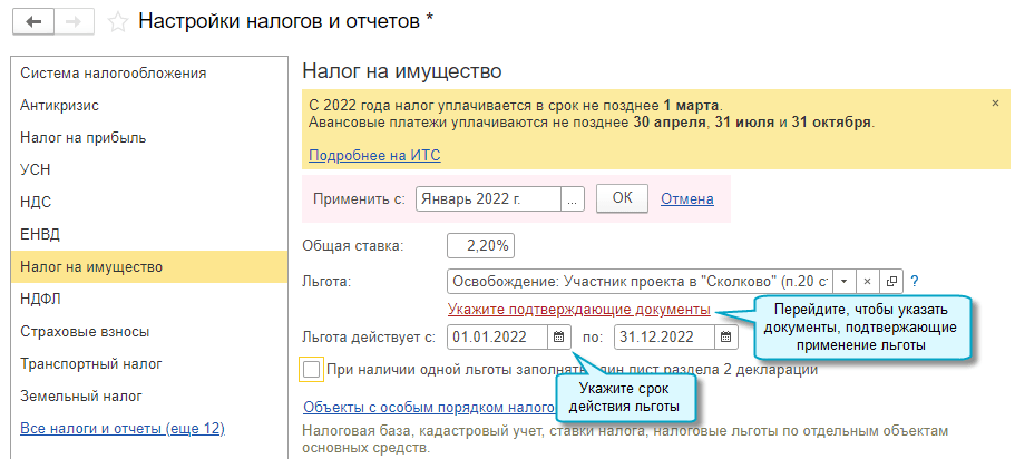 Полный интерфейс: меню "Главное - Настройки - Налоги и отчеты".