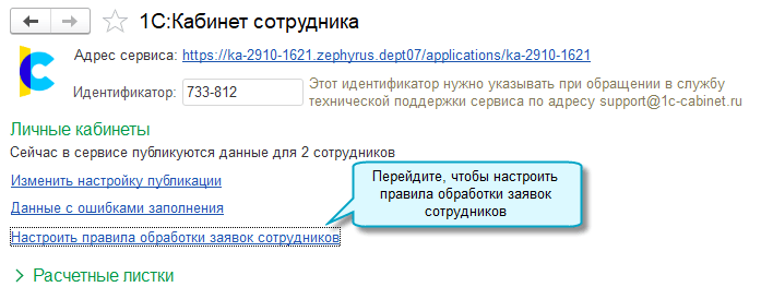 Полный интерфейс: меню "Зарплата и кадры - Сервис - Сервис 1С:Кабинет сотрудника".