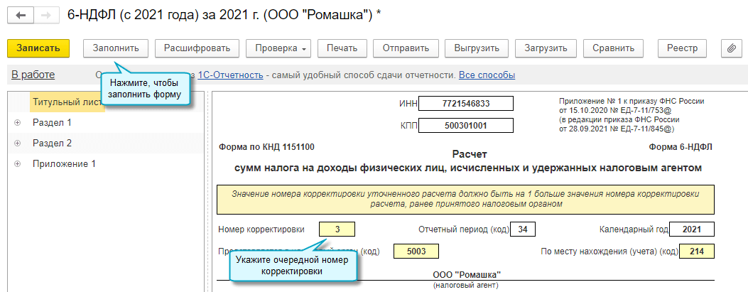 Добавлена возможность подготовить уточненную форму 6-НДФЛ, когда после ее сдачи изменены начисленные ранее доходы физического лица и НДФЛ. В этом случае заполняется корректирующая справка о доходах и суммах налогов физического лица.