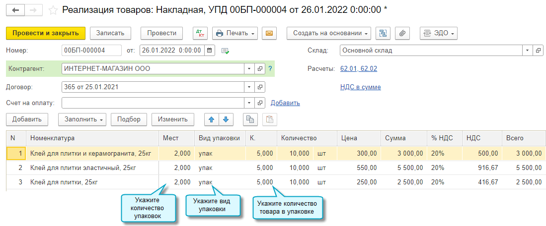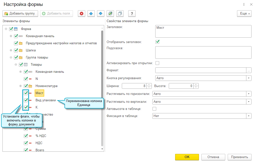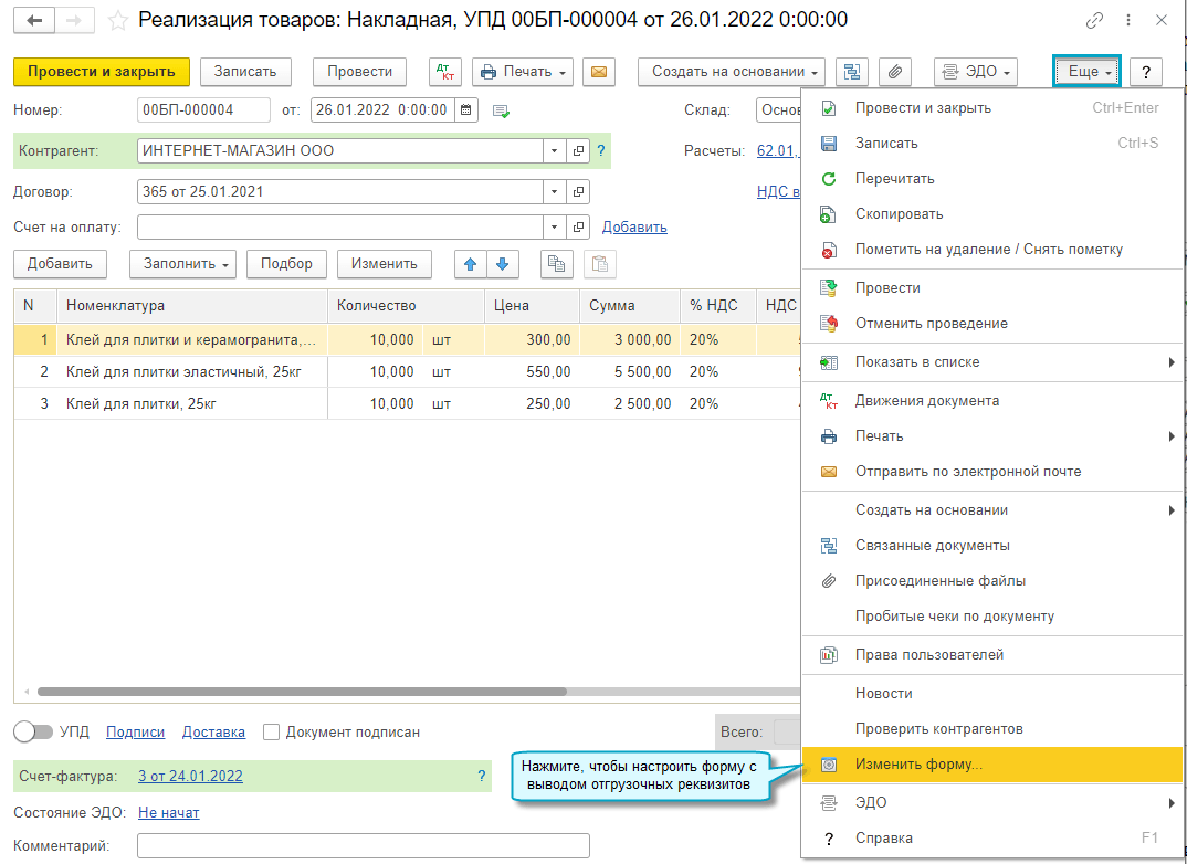 Наименование колонок в форме, настроенной с выводом отгрузочных реквизитов, приведено в соответствие с наименованиями колонок товарной накладной (ТОРГ-12).