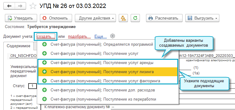 Сразу при обработке входящих электронных документов можно было создавать только документы: Поступление с видами операций Товары и Услуги, Поступление доп.расходов, Поступление из переработки.