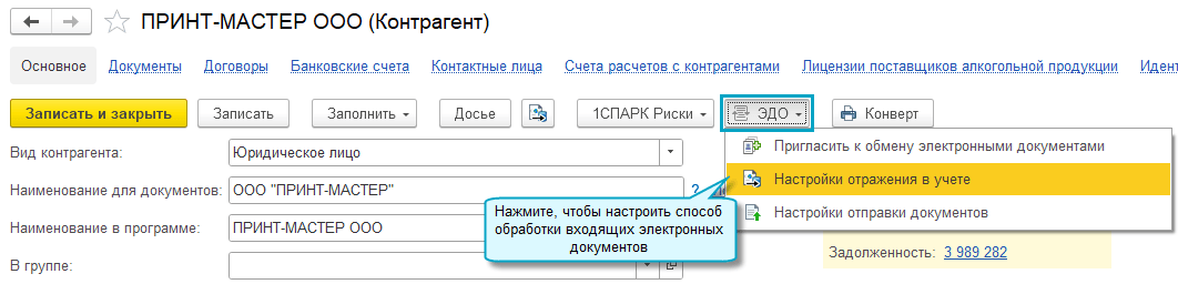 Полный интерфейс: меню "Покупки и продажи - Сервис - Текущие дела ЭДО".