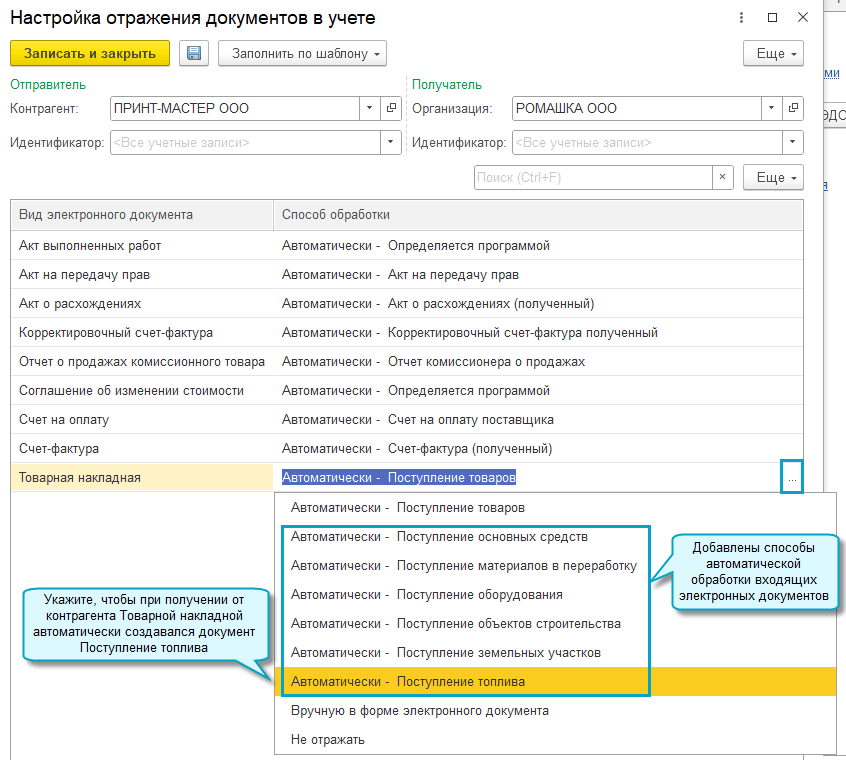 Также добавлена возможность настроить создание документов поступления с перечисленными видами операций при автоматической обработке входящих электронных документов.