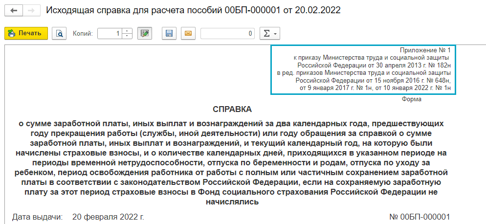 Добавлена печатная форма справки для расчета пособий, действующей с 20.02.2022 (Приказ Минтруда России от 10.01.2022 № 1н).