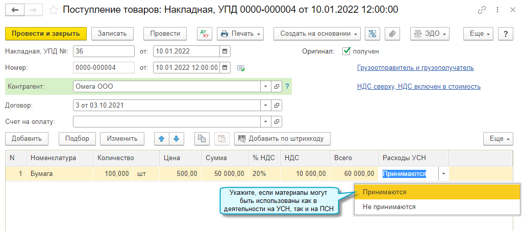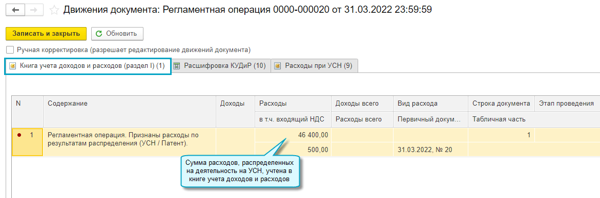 Распределение выполняется регламентной операцией Распределение расходов между УСН и ПСН при закрытии последнего месяца в квартале. Сумма расходов, отнесенная к УСН, включается в расходы в Книге доходов и расходов УСН.