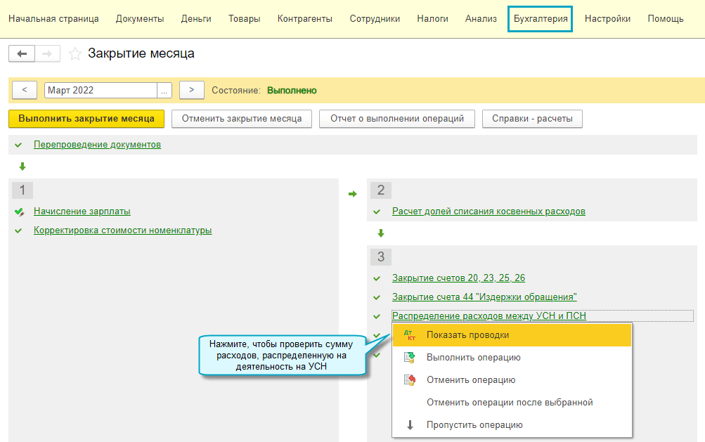 Полный интерфейс: меню "Операции - Закрытие периода - Закрытие месяца".
