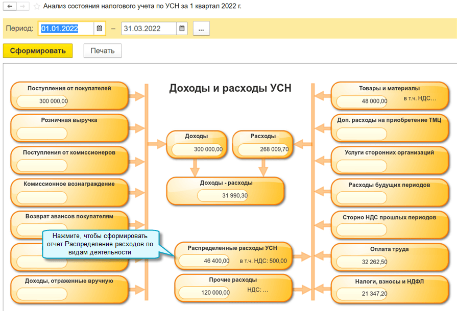 Добавлено автоматическое распределение расходов по видам деятельности при совмещении УСН (доходы минус расходы) и патентной системы налогообложения (ПСН). Распределять необходимо те расходы, которые нельзя однозначно отнести к деятельности на УСН или на ПСН (пункт 8 статьи 346.18 Налогового кодекса РФ).
