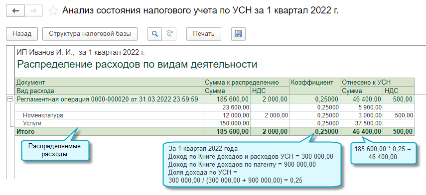 Распределение таких расходов выполняется ежеквартально исходя из долей доходов от деятельности на УСН или ПСН в общей сумме доходов за отчетный квартал.