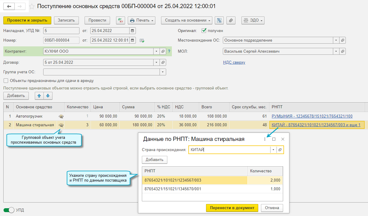 Добавлена возможность учитывать по регистрационным номерам партий товаров (РНПТ) групповые объекты основных средств.