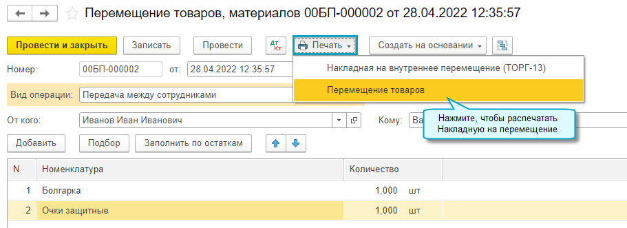 Добавлена возможность учитывать передачу между сотрудниками спецодежды и инвентаря. Перемещать можно имущество, учитываемое по сотрудникам на субсчетах счета МЦ "Материальные ценности в эксплуатации".