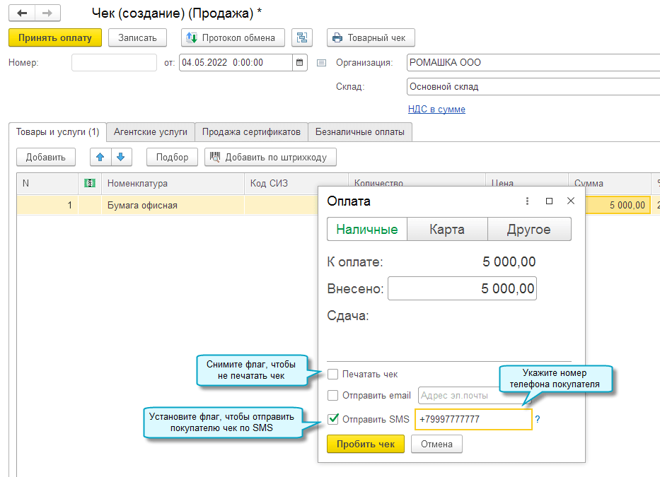 Добавлена возможность при розничной продаже отказаться от печати бумажного чека и отправить покупателю электронный чек по SMS или по электронной почте.